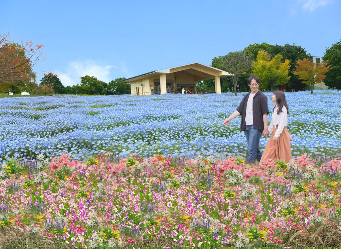 2026年のイベント「フラワーフェスティバル2026」では、花畑の中に「白いドア」や「ミニハウス」などの可愛らしいオブジェが設置されます。また、同じ時期にチューリップやポピーも咲き誇るため、ネモフィラブルーと他の花々のカラフルなコントラストを楽しめるのが最大の魅力です。GW期間中も楽しめる可能性が高く、家族連れにも人気のスポットです。
